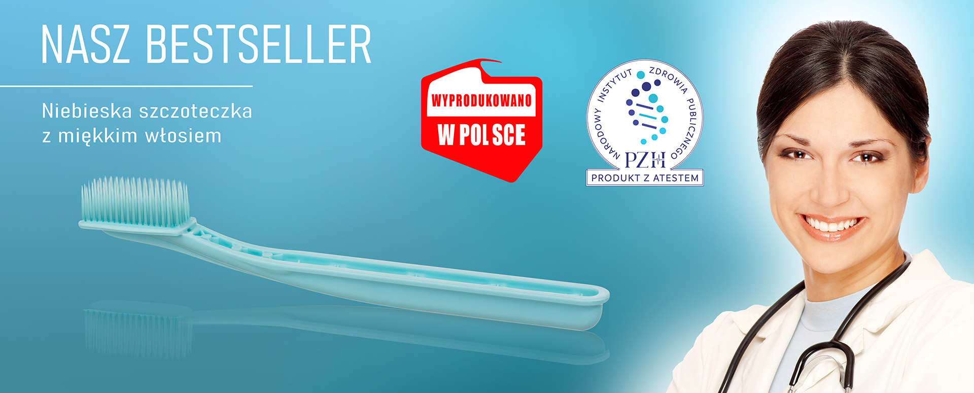 Szczoteczka z miękkim włosiem, po użyciu nadaje się do recyklingu. Produkt posiada Atest – certyfikat bezpieczeństwa i świadectwo jakości zdrowotnej. Produkt wyprodukowany w Polsce.